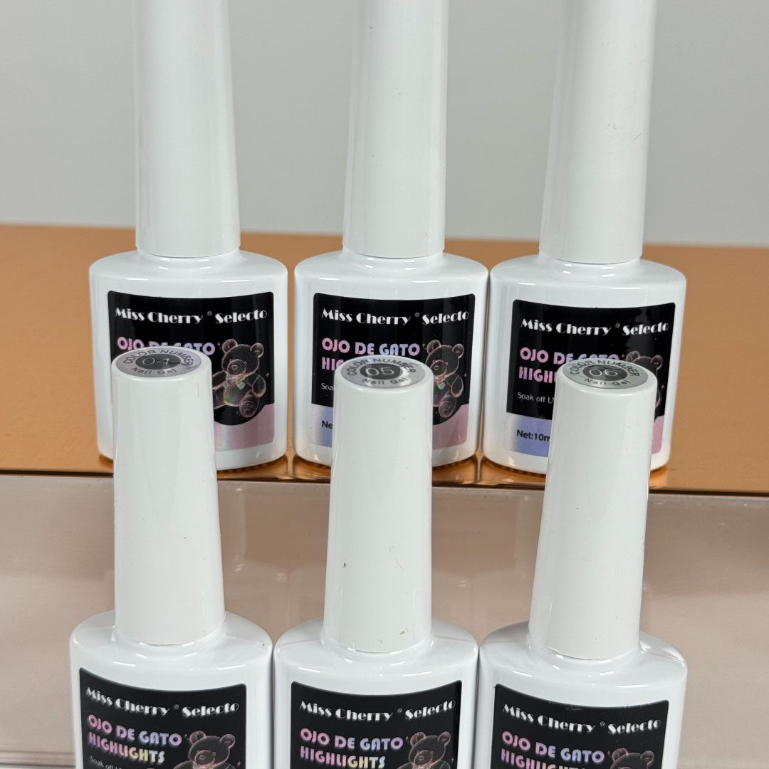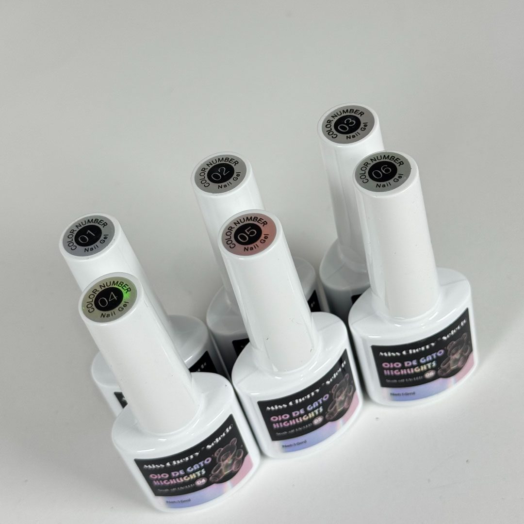 Gama A Ojo de Gato Highlights. Incluye 12 colores. (01, 02, 03, 04, 05 y 06). Gel Semipermanente de tres pasos.