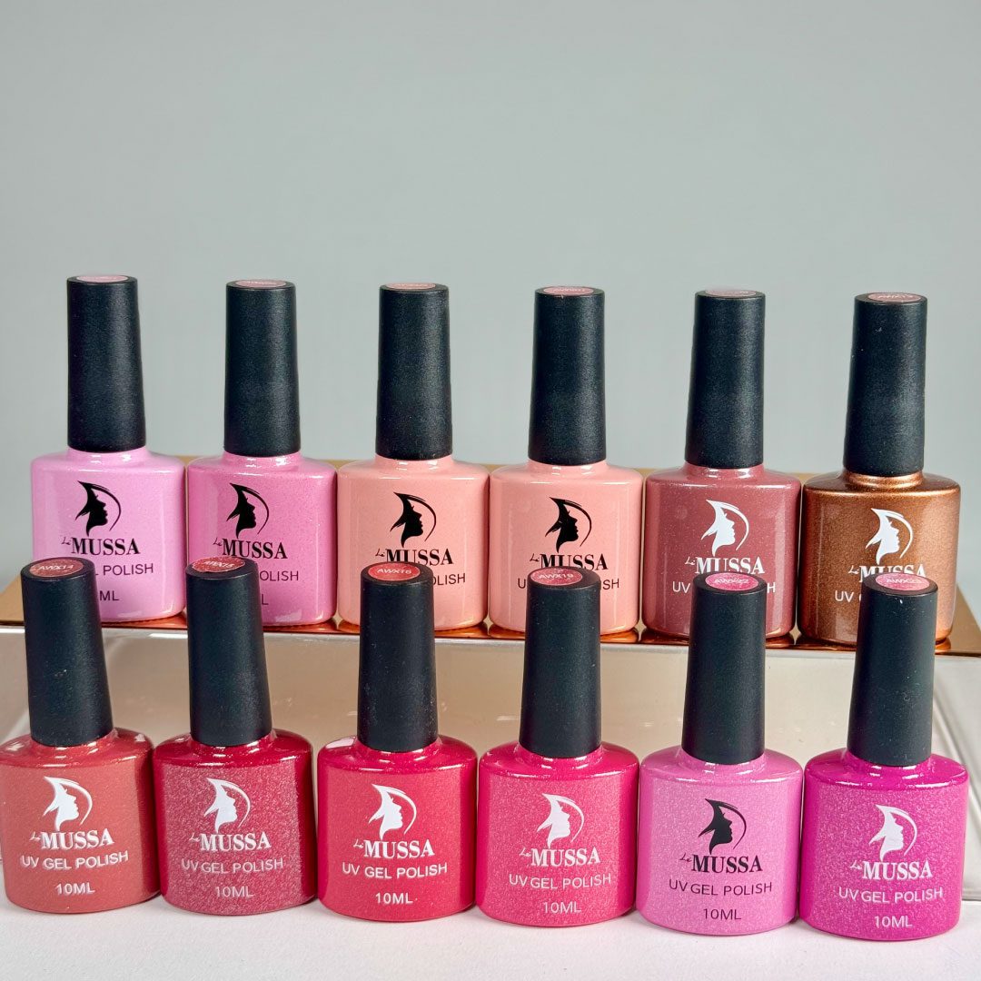 Gama Gel Femme Glitter Marca Mussa. Incluye 12 colores. (05, 01, 16, 15, 22, 23, 9, 13, 14,07, 09, 03)